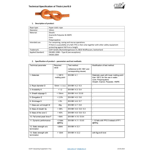THICK-LINE 10.0 是專為高強度使用 (Heavy Use) 打造的超靜力繩。 雖然它的線徑達到 9.8mm,提供了極佳的抓握感與操控性(這對初學者或商業團客人來說至關重要),但得益於先進的材質科技,其重量僅有 51.5g/m——這相當於市面上普通的 8mm 聚酯繩或 9mm 尼龍繩的重量。