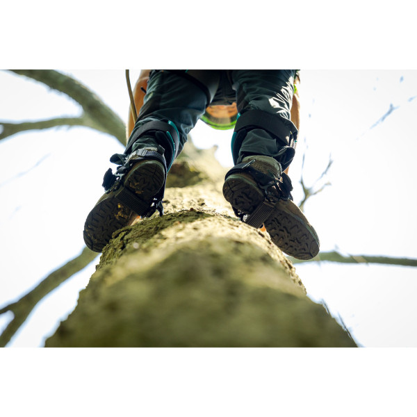 特殊的符合腳與腿自然角度的鞋幫與結構,有效減少壓力點與小腿疲勞,降低整日工作時的不適感。可調式袖口配合舒適泡棉墊,使壓力分布更均勻,有效降低小腿疼痛。全新的雙扣式腳帶系統提升穩定性,並支援更廣泛的攀爬靴款搭配。