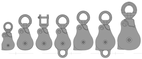 提供單滑輪與雙滑輪版本,滑輪尺寸從 1.1 吋至 2.6 吋,可因應不同吊掛與拖拉需求。